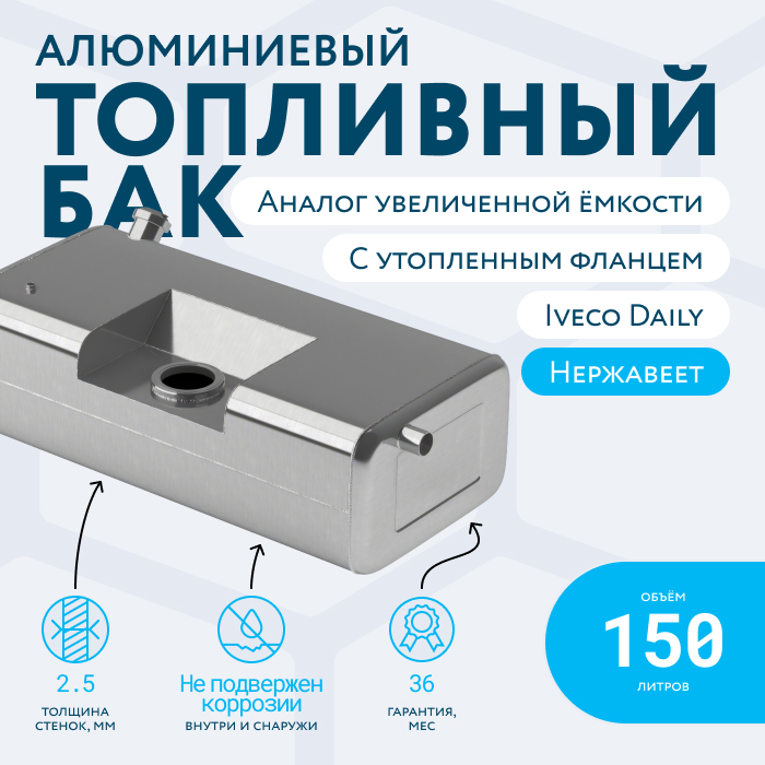 Алюминиевый бак не подвержен коррозии, что делает его более долговечным, а так же сбережет вашу топливную систему. Бак из алюминия в два раза легче стального бака, хотя он и изготовлен из листа увеличенной толщины в 2,5 мм. В конструкции предусмотрены цельные перегородки, которые проварены по периметру. Баки из алюминия так же оснащены заливной горловиной с самозапираемым непроливаемым клапаном (который становится барьером для разлива топлива, а так же становится защитой от попадания мусора в бак при открытой крышке) . Кроме того, однозначно что алюминиевый бак выглядит намного привлекательнее и дороже - где бак в том числе становиться и элементом тюнинга автомобиля. На алюминиеввые баки действует увеличенная гарантия - 36 месяцев.