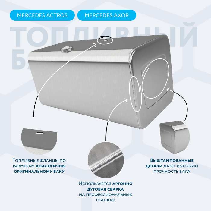 Алюминиевый бак не подвержен коррозии, что делает его более долговечным, а так же сбережет вашу топливную систему. Бак из алюминия в два раза легче стального бака, хотя он и изготовлен из листа увеличенной толщины в 2,5 мм. В конструкции предусмотрены цельные перегородки, которые проварены по периметру. Баки из алюминия так же оснащены заливной горловиной с самозапираемым непроливаемым клапаном (который становится барьером для разлива топлива, а так же становится защитой от попадания мусора в бак при открытой крышке) . Кроме того, однозначно что алюминиевый бак выглядит намного привлекательнее и дороже - где бак в том числе становиться и элементом тюнинга автомобиля. На алюминиеввые баки действует увеличенная гарантия - 36 месяцев.